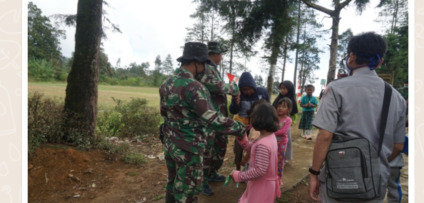 Rupanya mereka melihat anggota satgas TMMD yang sedang melintas, mereka langsung menghampiri dan mengajak berjabat tangan dan mengangkat tangan memberikan penghormatan layaknya seorang militer.