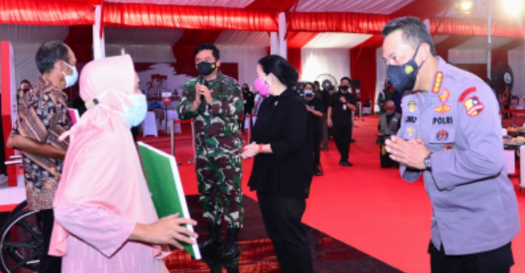 Mphnews.id-Jakarta – Ketua DPR RI Puan Maharani, Panglima TNI Marsekal Hadi Tjahjanto, dan Kapolri Jenderal Listyo Sigit Prabowo, meninjau langsung pelaksanaan vaksinasi massal, penyerahan bansos dan launching transformasi digital UMKM Presisi yang diselenggarakan oleh Alumni Akabri 1996 atau Bharatasena di SMKN 2 Tangerang, Banten, Kamis (23/9/2021).